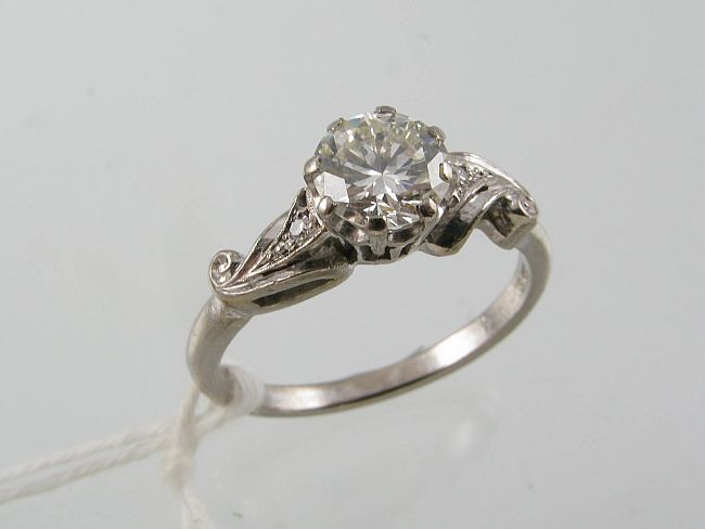 brilliant-cut diamond claw-set in 18ct white gold, with two shoulder diamonds. Estimated weight of diamond 0.93ct graded in the setting as Colour J/K. -