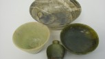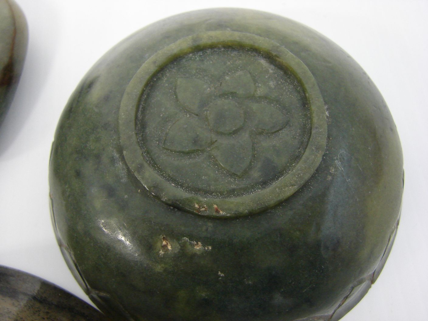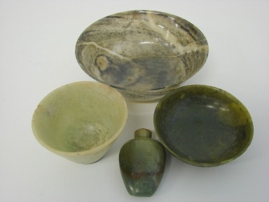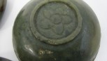 Including a powdery black jade bowl, a spinach jade lotus dish, a green jade snuff bottle and a light green jade tea bowl, 19th century and later (4 ) -