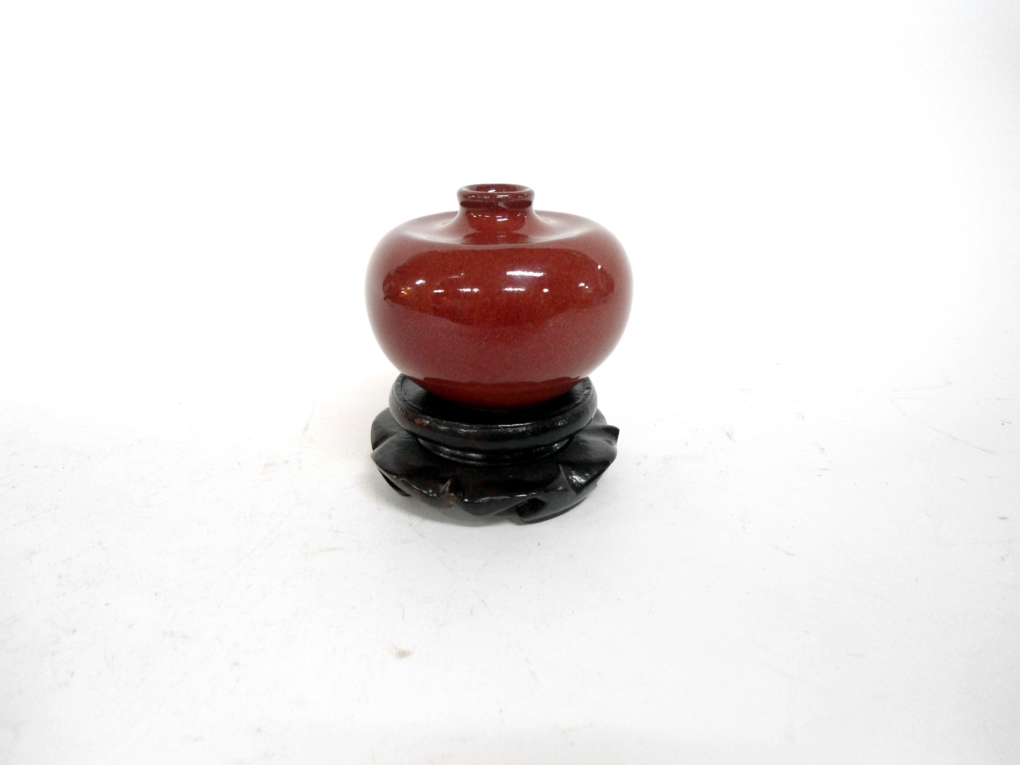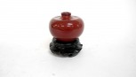 Lot Description:A Chinese red glazed water pot in the shape of an apple on a fitted stand.