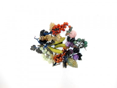 bananas and several other pieces of fruit all carved in semi precious stones and attached to a stem with silk thread. [10] 20th century -