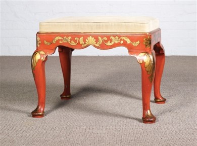 Lot Description:A Queen Anne red lacquer stool covered in suede