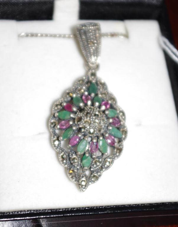 Lot Description:Silver, ruby and emerald pendant