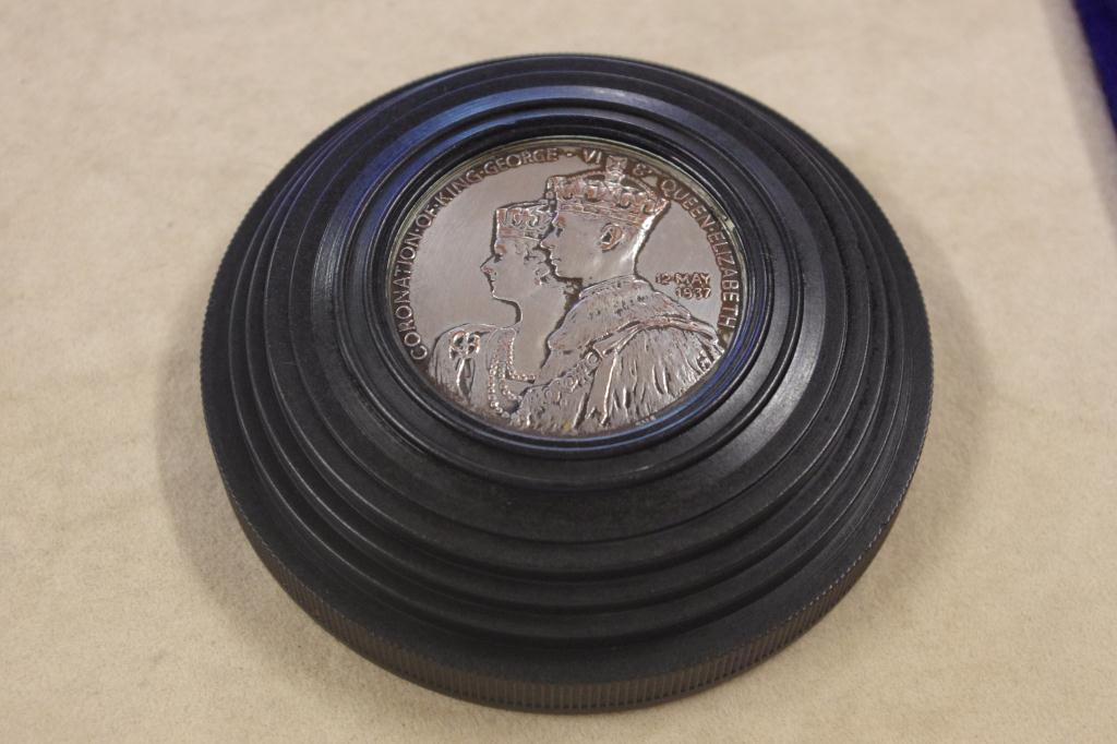 Medal "Coronation of King George VI & Queen Elizabeth 12 May 1936" set in bakelite disk "Coronation May 1937 Clay Pigeon Shoot Stratford-On-Avon" written underneath. 10.5cm diameter -