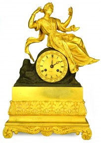 the dial surmounted by a woman in Orientalist costume, the dial with Breguet style hands, concentric line engraving, Roman numerals and floral decorated bezel. The mechanism striking on a bell and with silk suspended pendulum, the whole raised on a substantial ormolu plinth base embellished with stiff acanthus and anthenion leaves. -