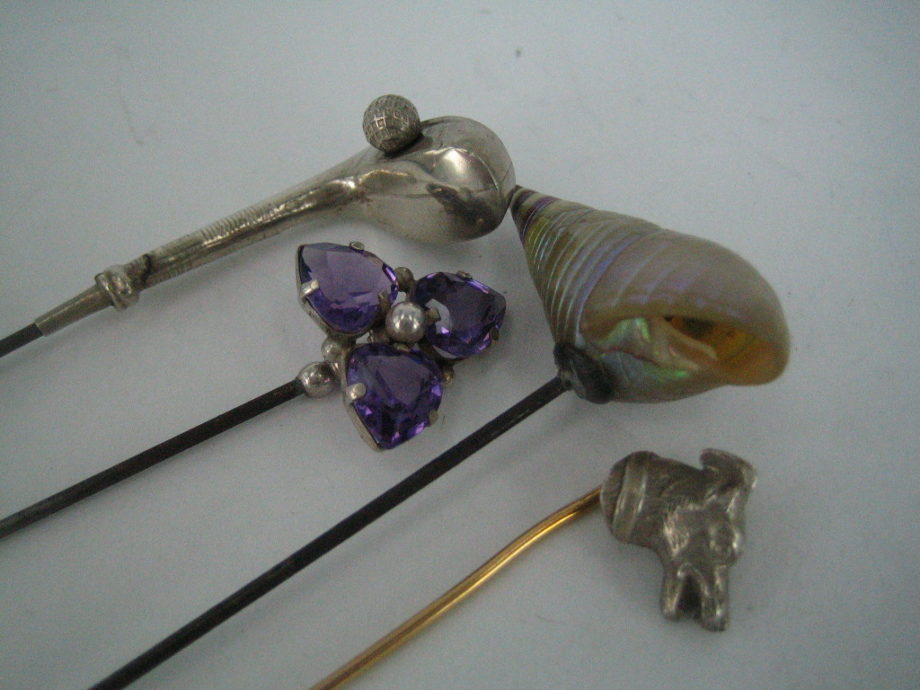 including an amethyst and silver trefoil hat-pin, Charles Horner, Chester, an Edwardian silver golf-c... -