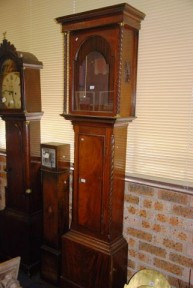 arched dial, turned fluted columns, inlaid stringing, comes with a cabinet key, height is 219cm -