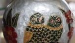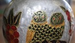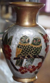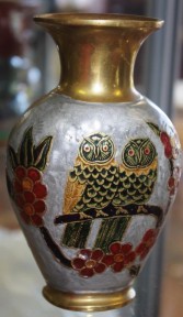 Lot Description:Brass and enamel vase with owl decoration