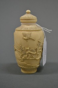 carved in relief with birds in flight against a rocky mountainous ground & blossoming branches & flowers, 10cm high -