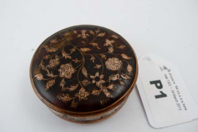 Lot Description:Antique Sheffield & Close Plate - Snuff box, tortoiseshell and pique lid, die stamped base (1755-75)