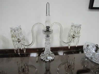 Lot Description:Cut crystal twin sconce table candelabra with drop prisms