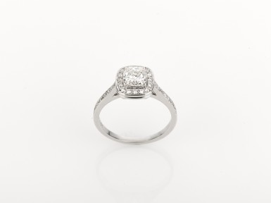 18ct white gold, diamond set shank flowing to diamond set basket, style setting containing a central cushion cut 1.01ct diamond with a surround of brilliant cut diamonds totalling 0.33ct, with DCLA Certificate