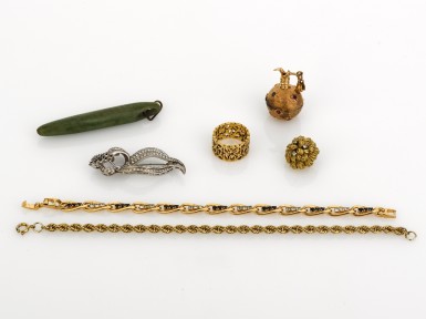 including 18ct gold wedder, white gold and diamond brooch, jade pendant, and various other pieces (7) -