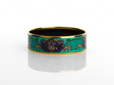 decorated with cheetahs and lions in coloured enamel, signed 'Hermès Paris, made in Austria' -