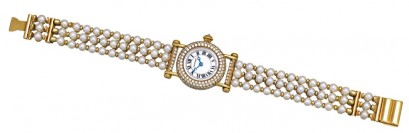 Quartz movement, mother-of-pearl dial, Roman numerals, secret signature at X, circular case, back secured by six screws, diamond set lugs and crown, 18ct gold and pearl-set Cartier triple row bracelet, case back numbered 1471 and C90013, case, dial and movement signed, 20mm diameter, 160mm length. -
