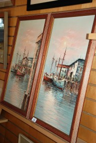 showing fishing boats moored at a jerry. Each 60x30cm. Signed -