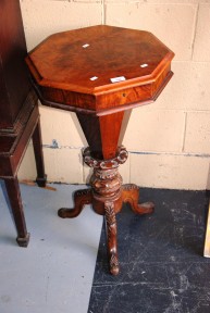 octagonal top, hinged lid, fitted interior on turned tripod base -
