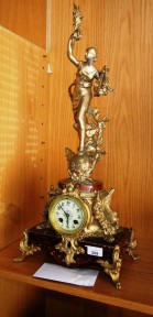 with rouge marble case, enamel dial with Arabic numerals, comes complete with key & pendulum, 67cm tall -