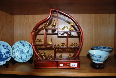of peach shape with multiple shelves containing 12 Chinese gilt metal zodiac animals, fitted with 2 drawers to base -