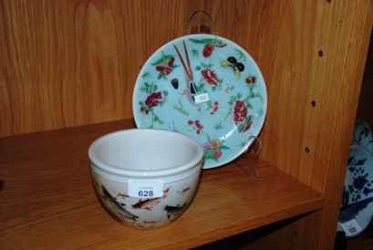 Famille Rose decoration with butterflies & birds on an aqua ground. Character marks to base. Has been cracked and has old rivet repairs. Diameter 19cm. Together with a small Chinese bowl decorated with Koi Carp & character marks to base. Height 9cm -