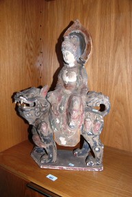 sitting astride a mythical temple dog with a natural pigment painted finish. Height 57cm -