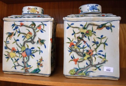 unusual shape, polychrome decoration with birds in tree and ducks on a pond. Each with a circular lid-6 character marks to underside. Height 34cm -