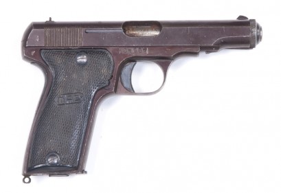 7.65 Cal; 9 rnd mag; 102mm (4") barrel; g. bore; MAB address & CAL markings to slide; wear to profiles & address; frame & slide have a faint reddish finish; blue to grip safety; fair MAB blk plastic grips; gwo & f. cond. -