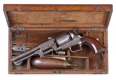 Notes:Presented in an English style oak case with coin escutcheon; partitioned & lined in gold/brown velvet, showing signs of wear & oil staining; with J. Dixon bag flask & oil bottle, Colt mould, nipple wrench & Colt percussion cap tin; all in vg cond. This scarce 2nd Model Colt Dragoon was found in Tasmania 50 years ago. C.1851. #11218 L/R