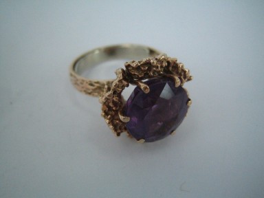 with a round faceted amethyst claw-set within a sexafoil border; 9ct gold. Estimated weight of amethyst 5ct. Wt 8.6g. -