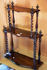 can be wall mounted, 3 shaped shelves with barley twists & turned supports -