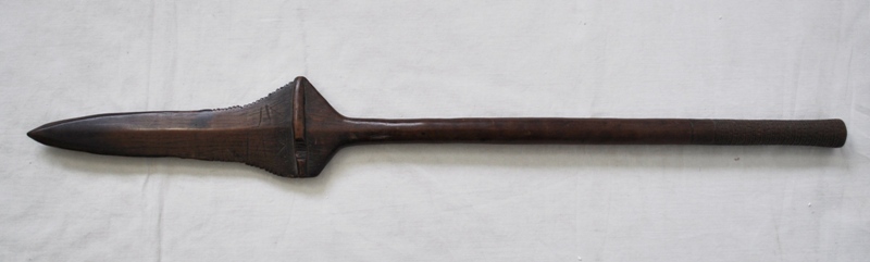 Hardwood blade form with sawtooth shoulders & 4 groups of incised letters. Hilt of handle has annular grip incissions. Reputedly collected by Martin Burrell (of the vessel Sandfly) in 1893. Handling patination & some old losses.