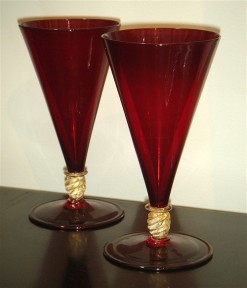 Lot Description:A pair red conical-shaped Murano wine glasses, Italian, circa 1960