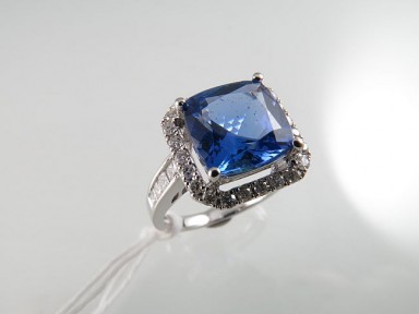 Lot Description:A Tanzanite And Diamond Border Square Cushion Cluster Ring