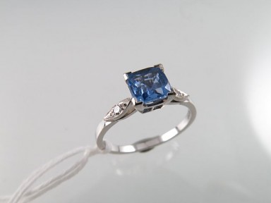 with a cushion-cut sapphire set with two shoulder diamonds in 18ct white gold. Wt 2.2g. -