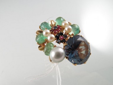 set with sapphires and rubies, pearls and a semi-circle of five cabochon emeralds claw-set with a large purple stone (synthetic corundum alexandrite type); unmarked, tests as 9ct gold. Wt 18.4g. -
