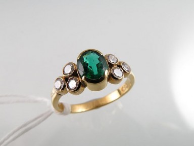 with a bright oval emerald of good colour with six shoulder diamonds; 18ct gold. Estimated weights: Emerald = 0.80ct, Diamonds 6 = 0.24ct. Wt 2.9g. -
