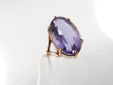 with a bright oval amethyst six-claw-set in 9ct gold. Wt 6g. -