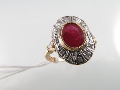 with an oval faceted ruby within a diamond-set border; 9ct gold. -