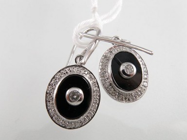 each with a small diamond within an oval onyx tablet and diamond-set border; 9ct white gold with hook fittings. -