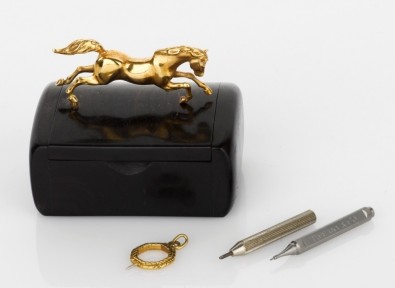 surmounted by an 18ct gold prancing horse, together with two Tiffany and Co. tooth picks