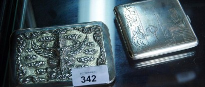 1 with embossed Thai religious image and the other engraved with an Egyptian pharaoh, no hallmarks -