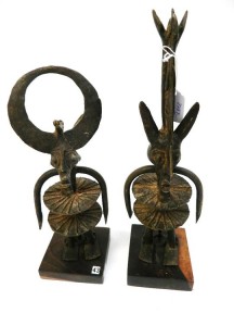 Lot #47 - Pair of Bobo bronze figures with striking head pieces and exaggerated mid-riff dance costumes mounted on ebony base