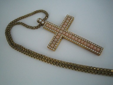 Lot Description:A Good Victorian Angel-Skin Coral Half-Pearl And Gold Cross And Fancy-Link Chain