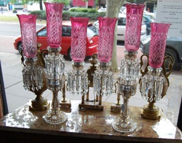Lot #188 - Fine pair of three stick ruby shade drop lustre candelabra