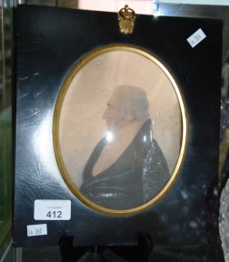 cut out silhouette style, gentleman in frock coat, original ink written label to rear, John Boneshie, died 23rd November 1812, drawn for Lady Parkyno by Thomas Iboneshie, 24th March 1813 at Edge Kiln, in ebonised frame with gilt brass mounts, picture dimensions 17cm x 13.5cm -