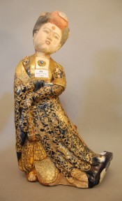 of a Tang lady, with later pierced metal decoration, showing winged horses, dragons & phoenixes amongst scrolls, with semi precious stones. 50 cm high -