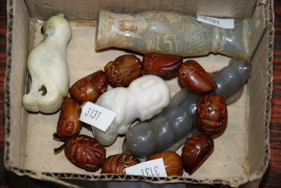 Lot #761 - Box containing 4 various stone carved pendants incl. caterpillar on a leaf
