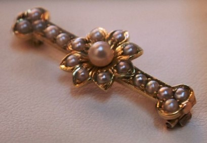 Lot Description:18ct yellow gold brooch with natural pearl setting