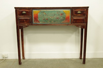 with two drawers flanking a central painted panel with floral and bird decoration.
