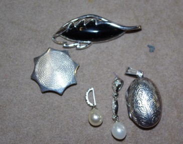 together with a silver locket, 2 pearl drops and another silver brooch -