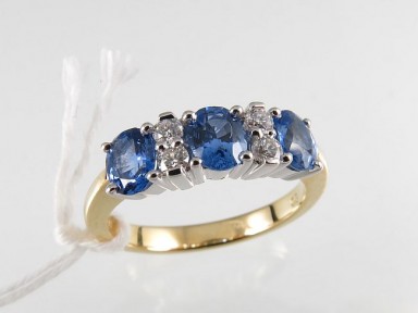 with three oval Ceylon sapphires and four diamonds claw-set in 18ct gold. Estimated weight of sapphires 3 = 1.29ct. -